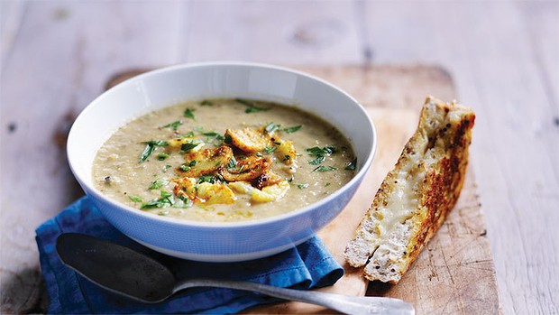 Heat remaining oil in a large saucepan over medium heat. Add leek. Cook, stirring occasionally for 5 minutes or until soft. Pour over stock and bring to the boil. Add roasted cauliflower and mushrooms and return to the boil.